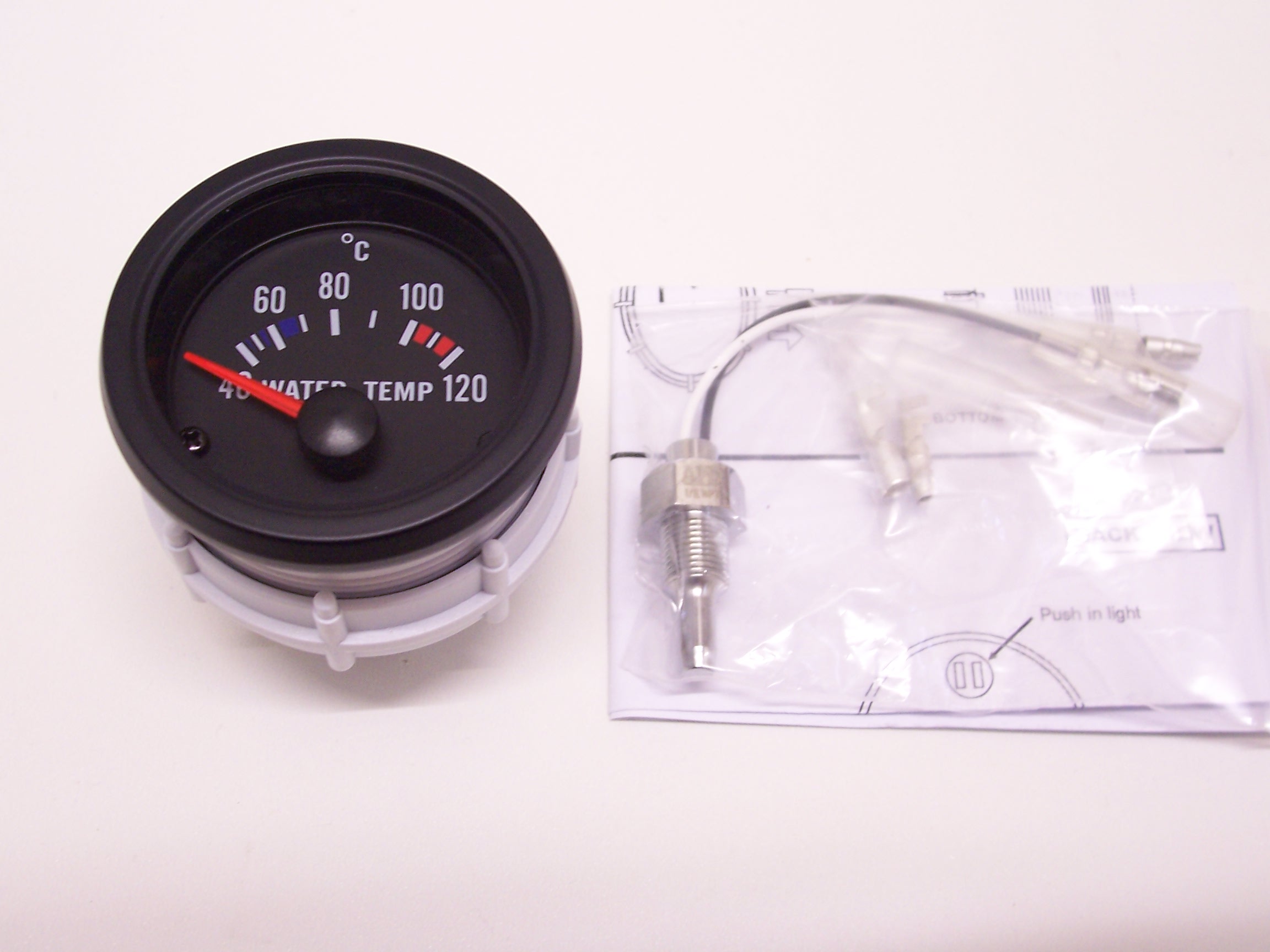 Schwarze 52mm universal Wassertemperaturanzeige Messbereich 40 - 120°C im Retro Look, zur Anzeige gibt es den Wassertemperaturgeber dazu. Mit der Anzeige wird die Wassertemperatur von 40 - 120°C angezeigt. Der Wassertemperaturgeber hat ein 1/8NPT-27 Gewinde. Die Anzeige hat eine weiße 12V Beleuchtung, die Glühlampe der Beleuchtung kann einzeln gewechselt werden (12V 2Watt ,Bild 3) oder kann mit zBsp. Tauchlack (zBsp Blau,Rot) umgefärbt werden, weiß beleuchtet ist die Anzeige schwarz, die Zahlen weiß und der Zeiger rot.